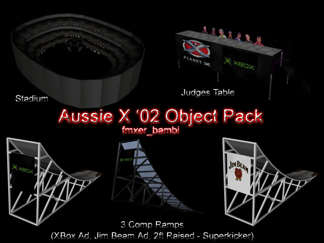 heres all the objects which I created for my track "Aussie X-Games 02", feel free to use them, modify any of the textures as you see fit, just give me credit for the original work.