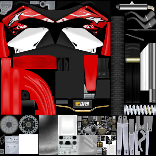 First off, Thanks to pokey dokey for changing my password back so it's possible to me to release my creations for the public to enjoy ! This bike started out as a request from Punkerjeffie acouple months ago. In the zip there's a version with and without black backgrounds, so everyone should be pleased ;) This one's for the MXU_CR250. Please download and REVIEW ! because I got alot more skins and tracks that will be released shortly, but the more reviews I get, the more i'll want to release them !! ;)