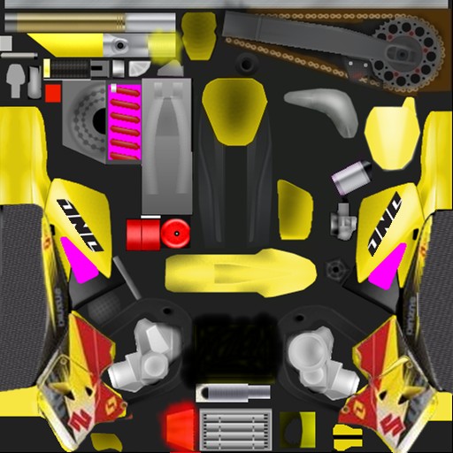 Hi, This bike looks nice in the game if you use the Suzuki FMX 3D model. I have fixed red hubs,yellow rims and the Dekals self. The template is the Suzuki FMX 3D model skin..
