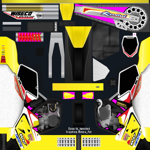 I know that a few people have made replicas of the Suzuki amatuer support team, but I wanted to try it too. My little brother has these graphics on his RM 85 and they are cool looking, so that's why I made this. The graphics were painted by me using Photoshop. I used tw0gh0st's seat from his amatuer Suzuki so thanks to him and I hope he doesn't mind. I used tk_tweaked's base that he recently used to make his 2005 RM250 skin which can be seen here: