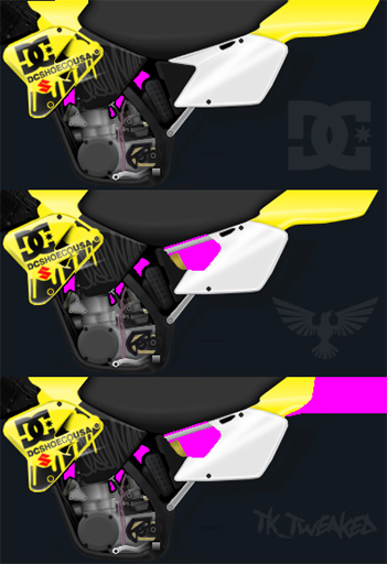 OK, well I decided that some people might want these graphics on a regular skin without all of Pastranas logos, i guess it'll make it easier if you wanna put your own logos or numbers on the number plates so they are... 3 different versions... one with no grab holes or cutouts, one with grab holes and one thats all choped up for all you hardcore FMXers, lol. Anyways download, review and Enjoy!!!