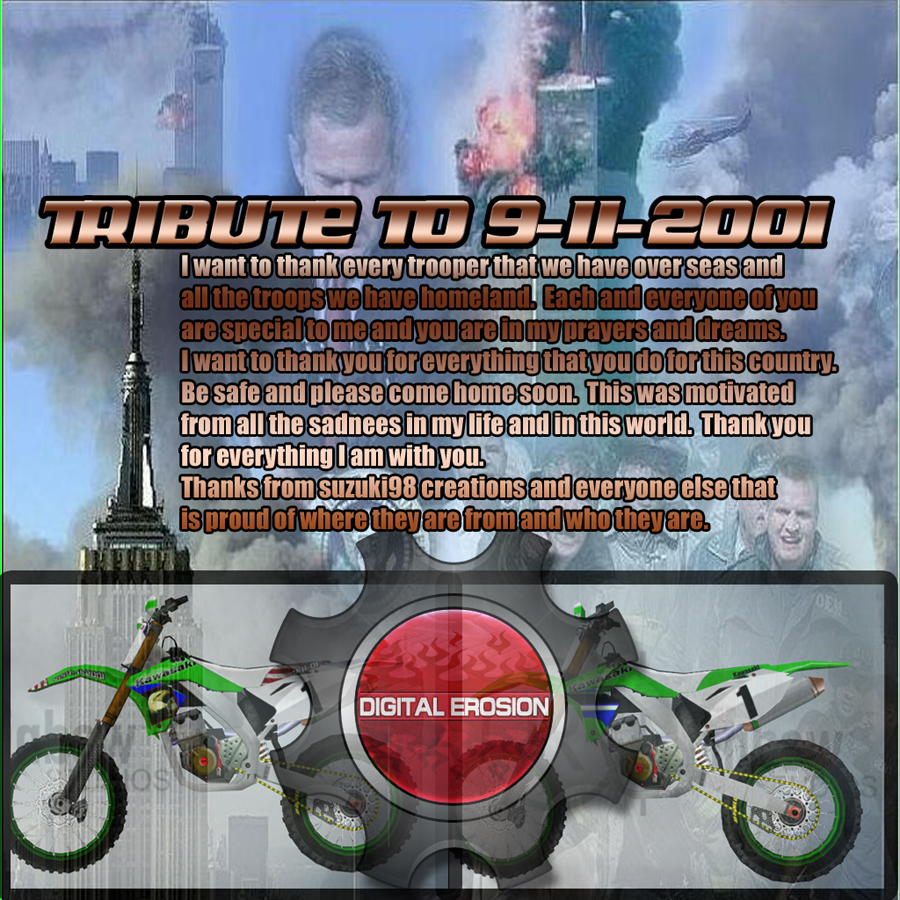 This is a tribute to 9-11-2001 just wanted to remember what happened and say thanks to all the troops out fighting. It should not have happened and we should not be fighting. Our men and women should be home with us. Wanted to say thanks and this is the only way that I knew how. Prayers and wishes are with you and your families and I am for sure praying for you. Good luck and come home soon.