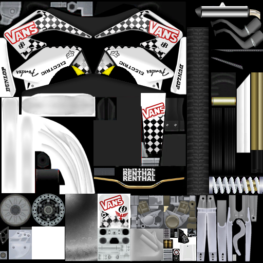 Ah well here is yet another skin from old dubbers. I really loved the look of the bike when I first saw it @ the second round of the Dew Tour (which I am currently making, VERY slowly (lost steam BLAH !)) Anyway, Yea i wanted to make it a pretty perfect rep and I think I did do pretty well. The only thing I didnt include was a logo on the side panel (couldnt tell exactly what it said) And thanks again to my bro Corpse for the noice little template ;) Bikes for the MXU_CR250 modelll. Download, REVIEW, and I hope everyone enjoys the bike as much as I enjoyed making it :D