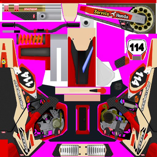 I Tried VERY hard to make the swingarm look aluminum like i really have, but it wasnt coming out good so all i did was lighten it up a bit to have that sort of effect.I did the best i could making all the carbon fiber parts. Around the left and right shrouds is the Lightspeed Air tract system. I made the carbon fiber case guards,frame guards,carbon fiber tank,head pipe gaurd,fork gaurd,and chain guard as well. Comes complete with WB carbon fiber exhaust system,a RK sproket,Scott steering stabilizer,and tag t2 bars(not replicated on my skin,just black color) with black grips. My foot levers and kick starter are anodized a dark gold color,and the top of my engine case was sandblasted with the same metallic red used on the frame and subframe. I made the front number plate which is an exact replica of my real one. The graphics are pretty much spot on.I only added like 3 different stickers because i got lazy LOL. I'll add them if you guys want.