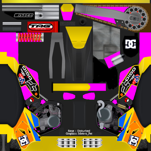 This skin was inspired by Xeroxed's ECC FMX bike. I thought it looked really cool so I made my own version with really cool custom DC Shoes graphics and a lot of stickers on the side-plates.