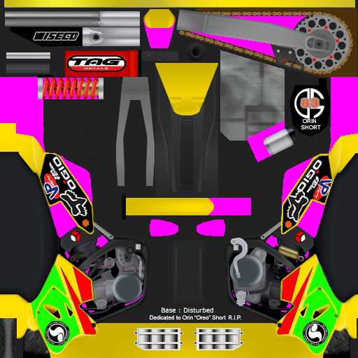 I made this one for Orin "Oreo" Short. I just heard that he passed away, so I touched up a skin and put his logo and name on the number plate. I didn't know him too well, but I once helped him out with fender cutting for Freestyle skins. He was really nice to me and said thanks for the help. He also told me that the bike I made looked sweet. I never thought I would make a skin for him like this, but, here it is for you Orin...