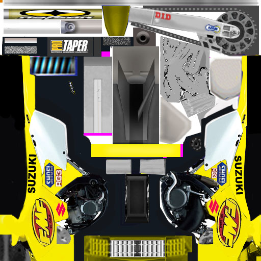 This is my custom FMF RM 250. It looks really cool in the game my third bike skin.Looks best with the Td_o3 rm125. I made a chrome pipe and grey hand guards so it looks really cool.Alright D/L and enjoy
