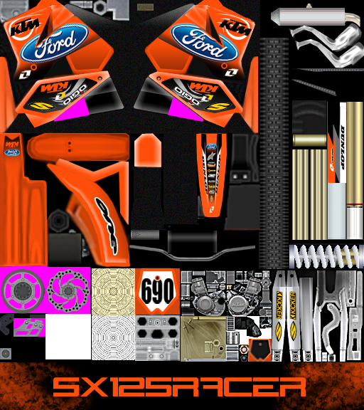 hi again guys...this is my last job,the ktm of kenny bartram,one of the most famous fmx rider..i've made the graphics,the seat ,pipe and silencer,and some shadows...this skin work only with the MXU_KTM125 of bike switcher,please leave some commente,enjoy ;)