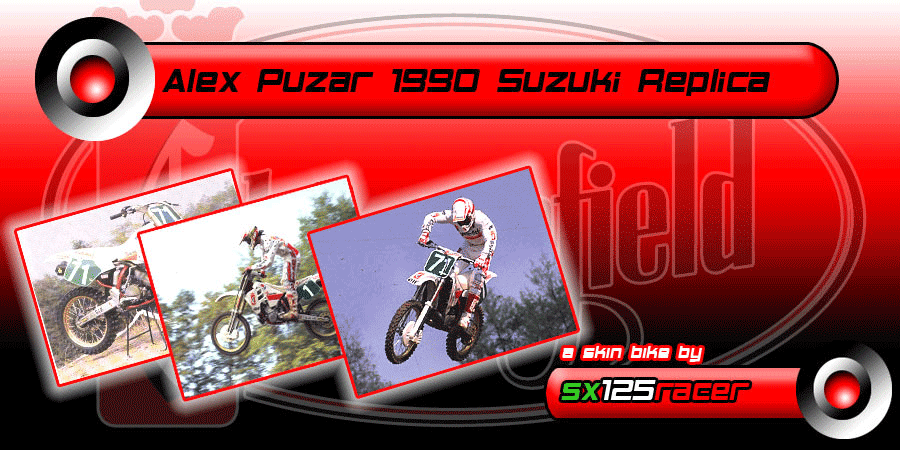 Hi guys!i've a new type of skin for u: this one is the old bike Replica of Alex Puzar (3 times world champion) when he wins his 250 cc world title with the Suzuki Chesterfield Team at Unadilla track.Alex was one of the most strong rider of italian mx story and i'm really proud to have made this.