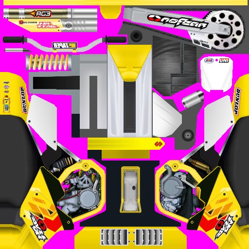 Nothing special about this bike other than its a Suzuki FMX special, i didnt know what bike to build ya's so i decided on this one to get it out of the way, customised oilpan etc new guards reshaped frame for support, usual logos plus a few extras, i left the numberplate blank as this bike is a stock model and u can see your numbers on it, all areas are shaded and i added a grip tunnel on the side fenders for ya's.. hope you have fun with it.. :) peace