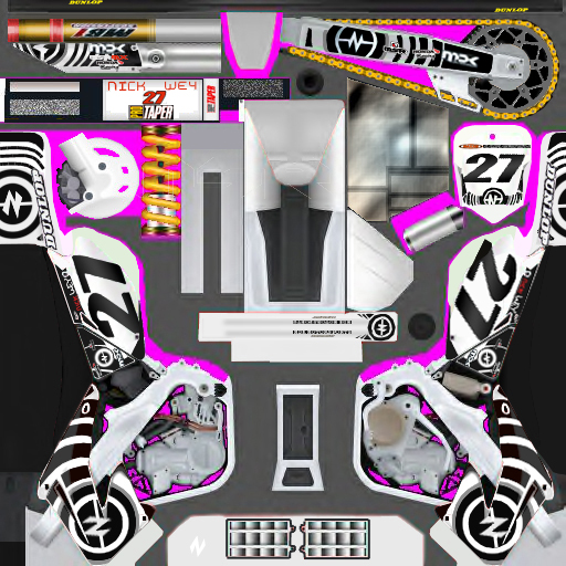 I use VMX gravitys 04' CR250 base, the pipe and bar pad set up came from tweaks Suzuki RM250, the chain came from 6rilmx's LUSK yammy, and i used the front brake cover from disturbed's 03 Kawy base. I did the graphics and the rest. The reason why NYk has these wierd but cool lookin graphics on his bike is because at the time of the US OPEN, he didnt know if Honda would be supporting him or not yet with his deal at MDK. thats why no huge honda logo was on his bike. MDK is goin to be in a semi next year, courtesy of MDK Motorsports, which is owned by one of the owners of Yahoo.com. Nick also told me that his 05' STOCK rear shock on his Honda CR250 is better than his $50,000 dollar rear factory Suzuki shock, pretty funny huh?, just shows that RC made the wrong switch.