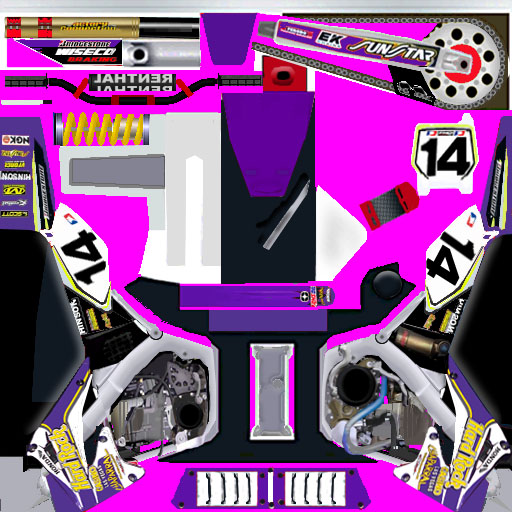 ok well .....i cant say that i took a life time to make this bike because i didn't i simply took my regualr,kevin windham bike that i made a while back.and converted it to k dubs hard rock ride that he was riding in las vegas,this past weekend .id like to thank vmx_gravityx2 for the frame i just couln't think of a better one to use he he. so thanks man it looks great. now on to what i did since this bike has all purple plastics and is basicly purple allmsot evey where,for the first time ever i have used the pink showing to my advantage i bealeve because there is a lil pink on the plasticsof this bik. NOW IM NOT TALKKING A CRAP LOAD! just a lil around the edges now u may think i mest up, wrong! i did it on purpose,i bealve that since the plastics are the color they are the pink makes it look like a lil bitt of a reflection it looks really cool i think. so anyway d/l enjoy its for the regualr stock mcm2 bike model.thanks