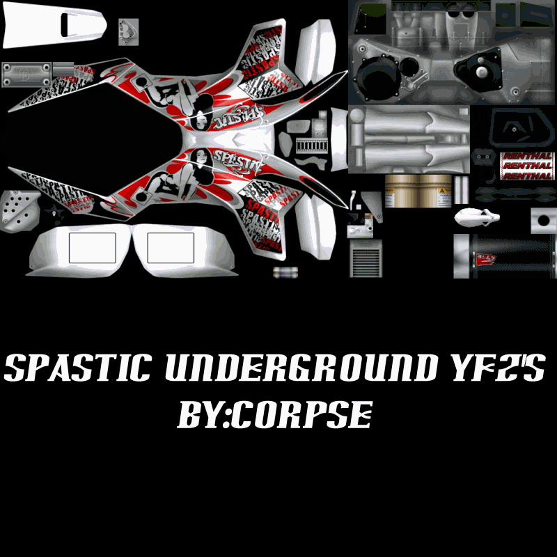 This is the Spastic Underground Graphic Kit for the yamaha yfz 450. These skins replace the stock ugly Rainbow Studios ATV\'s. I hope u guys enjoy the quads and have fun with them. Pls download and comment on what u guys think about it..