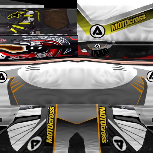 This is not quite exact, but as close as I could get it. I pretty sure its Disturbed's helmet and boots, so thanks to him. Without that I would have a headless, footless rider. Alba, the brown and tan acerbis is comin up next.