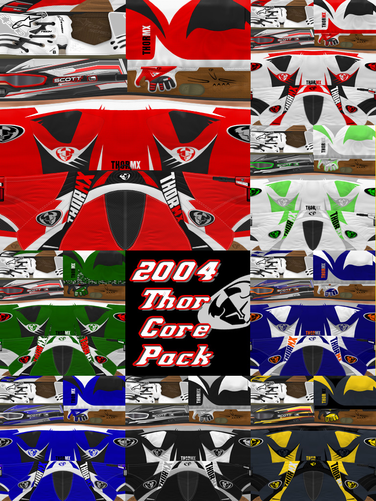 Ok, everybody here it is... the complete 2004 Thor Core Gear Pack! These are the basic colors that Thor make right now but i'll have the Special Editions out soon (Yamaha, Pro Circuit, YOT, Reed's Mosiac blue camo...). I worked really hard on these skins and put tons of detail into them. The helmet didn't turn out exactly how i wanted but it still looks sick in the game. Please leave me a review and tell me what you think ! I put a lot of time and detail into these skins and i wanna know what everybody thinks of them. Well anyway, download and enjoy!!!