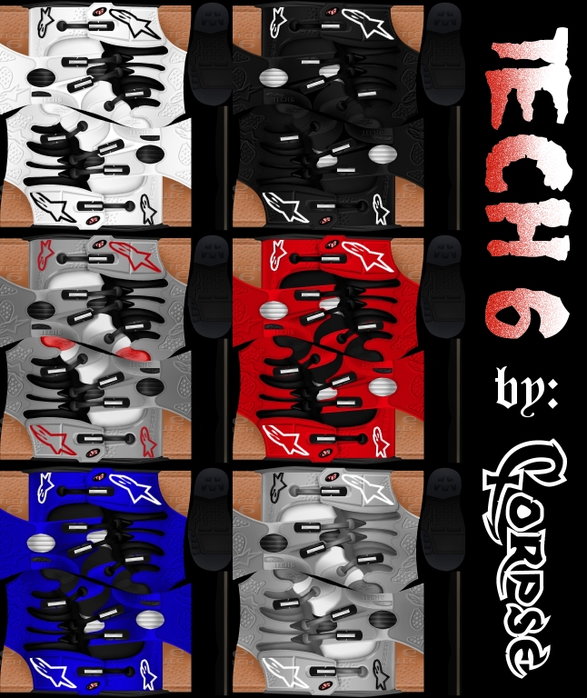 Sup everyone here is some alpinestart tech 6\'s they look alot! better then the tech 7\'s i made i personally think so, they replace the ugly THQ boots u have a choice of white, black, blue, red, silver and red, and even the stella version for the ladies that ride if they play this game, but anyways everyone enjoy it and plz review.