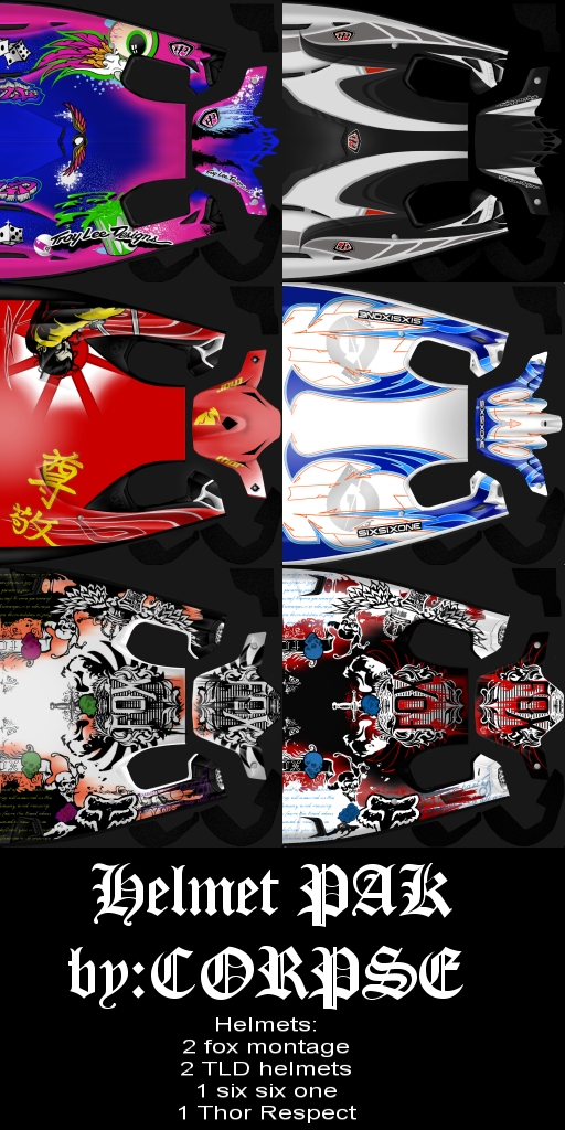 I been working on this helmet pak off and on, main reason took me sooooo long to finish this thing up was lack of helmet ideas pictures blah blah u know how it goes, but in this helmet pack u are getting 2 fox montage helmets, ( gear will be released later to match em ) and 2 tld helmets peice and wheelies and forgot the other tld helmet name, but u also get the 661 helmet, and the thor Respect helmet so enjoy , download and plz review......