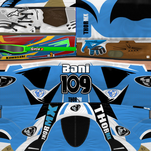 I was bored last night and here's what kept me busy. Its a Matt Boni (obviously) rep. The blue isn't exactly the Thor blue, but I like this look better. Also included is a namless set for your PERSONAL use only. Don't put your name on it and upload it. Its wrong to steal other's work, and nobody wants to ride with your name on their jersey. I started this from scratch, a first for me. But, boots are by Disturbed and gloves are by Tweaked, only cause I was sleepy when I got to doing the gloves. Everything else by me.