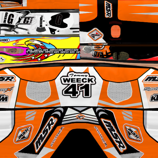 well here is tommy weecks gear (A.K.A) tff_fourone, i started this gear a while back now im not even, sure when like maybe a mounth or two. lol hes waited a long time for it . well anyway here it is and, why am i uploading a personal rider skin? becuase hes not just a rider. he races mx as a career and as far as iv seen has a hell of a bright future in it. so theres my explination foos! lol well, lets get to the gear i made everything, pretty much my self i didnt use anybody elses parts. and so thats about it d/l enjoy and don't worry tommy u know our deal on the rest of the stuff i made. Dobe go eat another power bar! while i grub on my pizza :P lol
