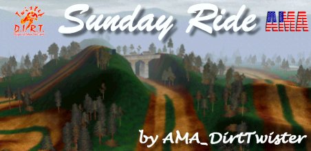 I have been working on this track off and on for a long time. My main concept was a nice Sunday ride on an old dirt road. I wanted a track that had a lot of air and was fun to ride with bikes of all sizes. Because of the crash physics of MCM 2 I had to back off a lot of what I originally had done. This track is fairly forgiving and you can get some pretty good air on it. I worked a lot on trying to get the AI to ride it and I was not successful. You should be able to lap all of the AI within 5 laps. If I could get them to stop doing stunts it would be much better for them. An AI lap consists of stunt crash, stunt crash about seven or eight times a lap. If you like to explore, throw this track into practice mode and take a spin around the outer edges of the track. You should find some interesting things to jump on, in, or over. Just follow the hay bales with the arrows. If you like stunts, then put this track in your quarry folder also. Do stunts while riding the track or head on over to the bus jump and follow the ramps until you get to the two pairs of ramp to ramp jumps. The smaller ramp to ramp should be taken at about 45 mph and the tall near vertical ramp to ramp should be taken around 52 mph. Practice jumping ramp to ramp and when you have that down start doing stunts. If you want to try that ramp that has the detour sign on it, be sure to hit it at about 95 mph. I hope you enjoy. Bruce (AMA_DirtTwister)