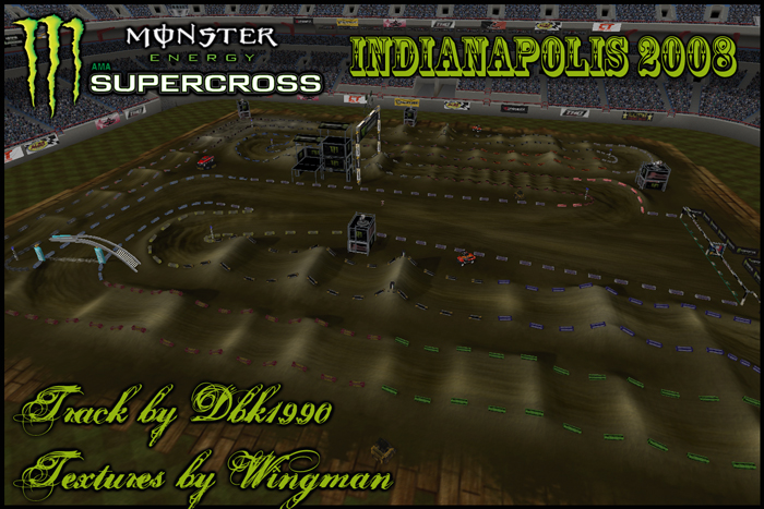 Disp Map: An Exact Replica of the 2008 Indianapolis supercross track. The track scale is very realistic, as are the heights of the jumps. Pro lap times are possible to get (45\'s-47\'s) and corner ruts are exactly where they were at the race.